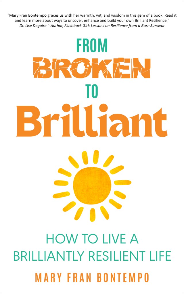 From Broken to Brilliant: How to Live a Brilliantly Resilient Life, by Mary Fran Bontempo When you are racing to respond to one of life’s many crises, Mary Fran Bontempo has your back. This book—published on Kindle today—is a “go bag” of useful strategies: nuggets culled from her own hard-earned experience and the wisdom of more than two dozen podcast guests. Delivered in her characteristic sassy style (she puts the “smart” in “smart ass”), the book also includes practical reflection questions to help you apply each insight to your own life. It’s a master class in getting a grip while remaining endlessly kind to yourself! GIFT THIS TO anyone at whom life has thrown a serious curveball.